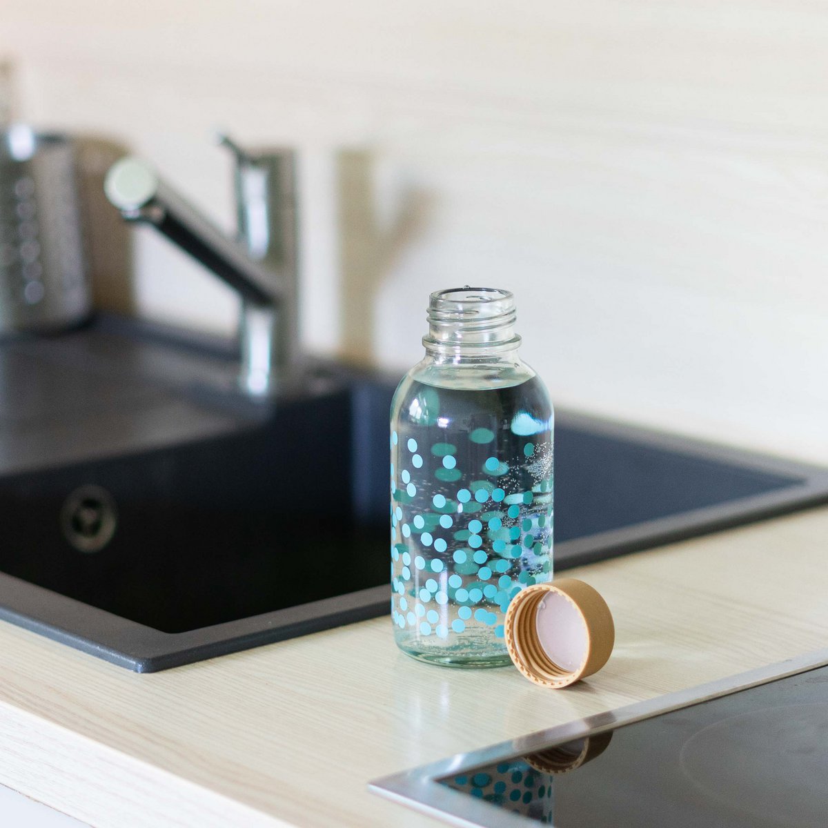 De PURE GELUK glazen fles van 0,4 l brengt een vrolijk dessin en frisse kleuraccenten in je dagelijkse routine. Het PURE HAPPINESS-motief met turquoise groen en stippen zorgt voor een speels, verfrissend uiterlijk dat meteen een glimlach geeft. Dankzij het slanke formaat (hoogte 17 cm, diameter 7,5 cm) past deze fles makkelijk in je tas of in de deurvakken van de meeste koelkasten.