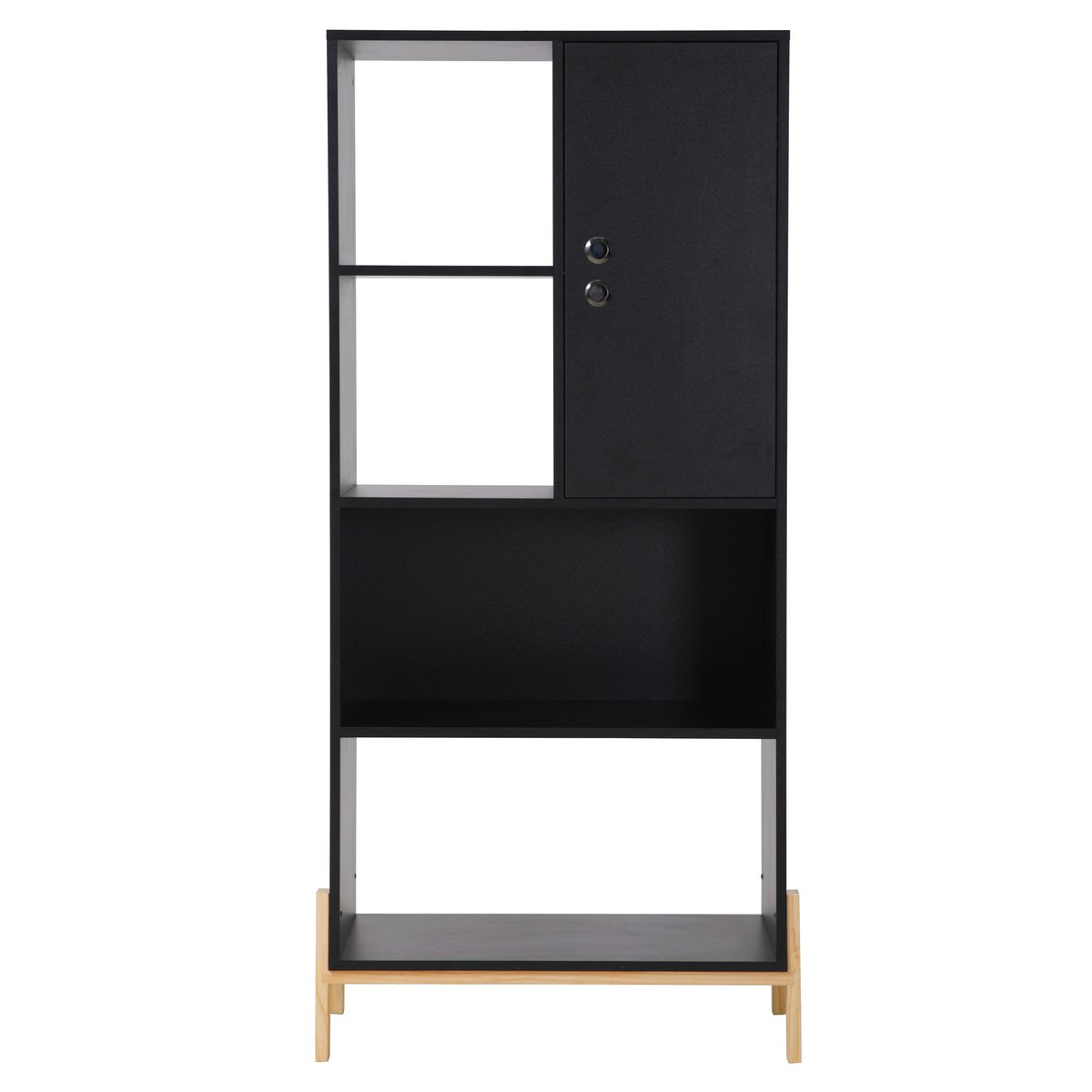 Deze zwarte plank met lichte grenen poten is een opvallend meubelstuk dat direct aandacht trekt door de asymmetrische indeling. Drie van de vier vakken hebben geen achterwand, wat de plank een luchtige en open uitstraling geeft. Achter de deur vind je een afgesloten vak waar je spullen netjes en uit het zicht kunt opbergen. Het resultaat is een praktische én decoratieve oplossing voor in de woonkamer, hal of slaapkamer.