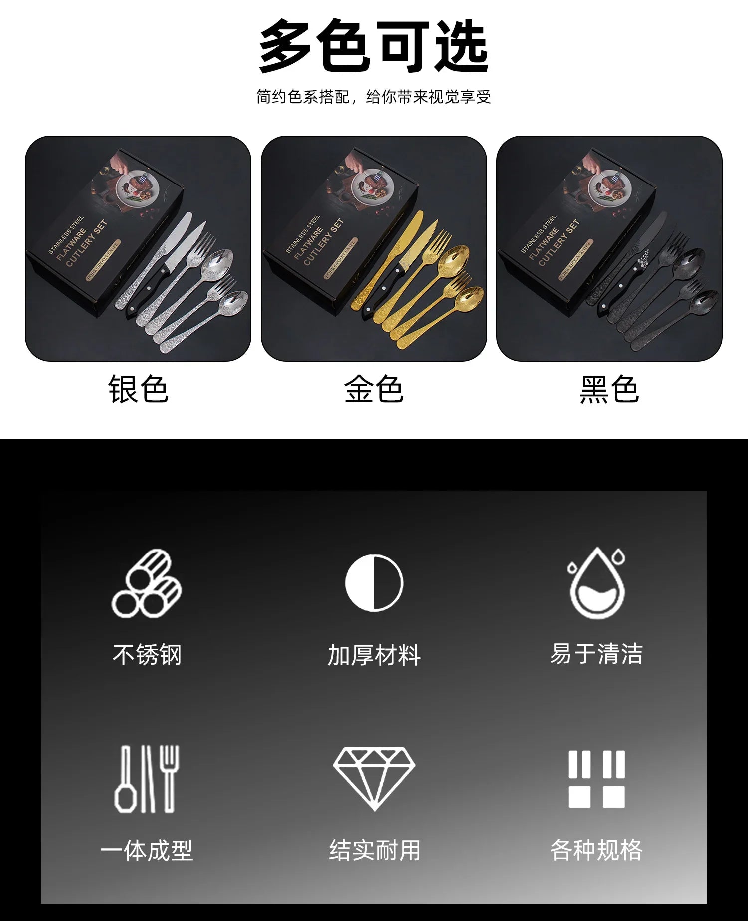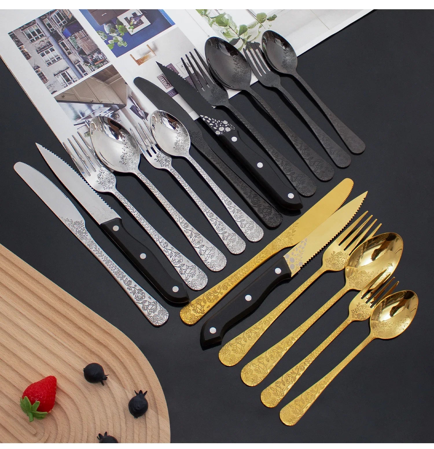 Om ervoor te zorgen dat de set perfect aansluit bij jouw inrichting, is het bestek verkrijgbaar in drie elegante kleuren: zilver, goud en zwart. Zo kun je snel de juiste look kiezen die past bij jouw stijl.