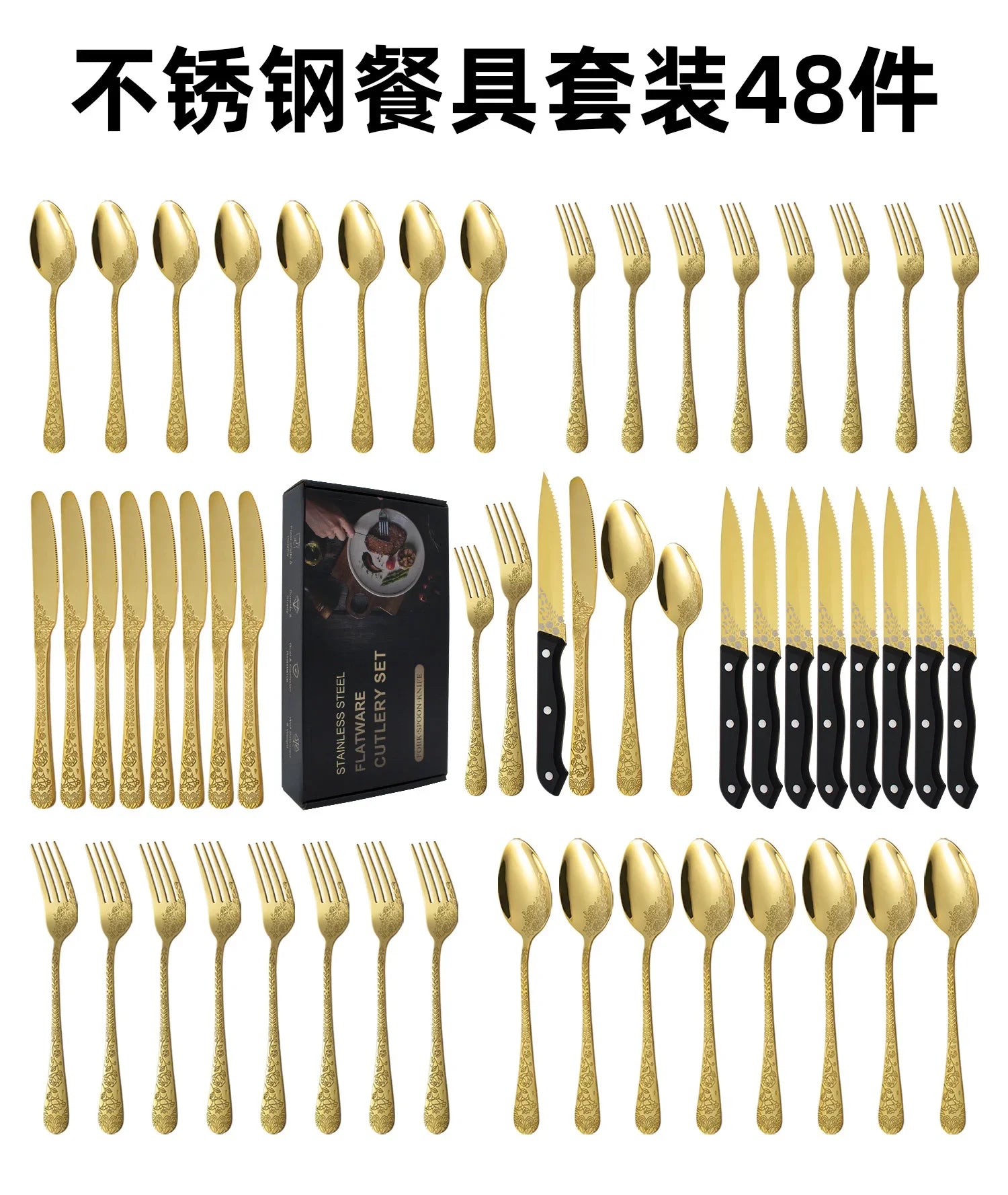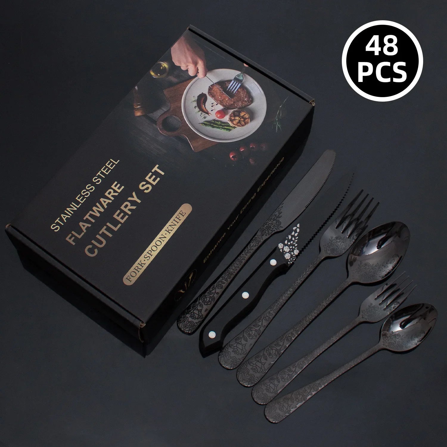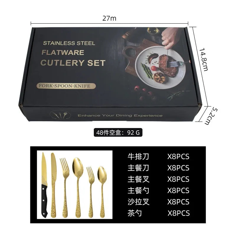 De 48-delige set biedt een complete tafelopstelling voor diverse maaltijden en gelegenheden. Met steakmessen, vorken en lepels ben je direct klaar om gasten te ontvangen. Het gemak van een complete set in één keer is ideaal als je efficiëntie waardeert.