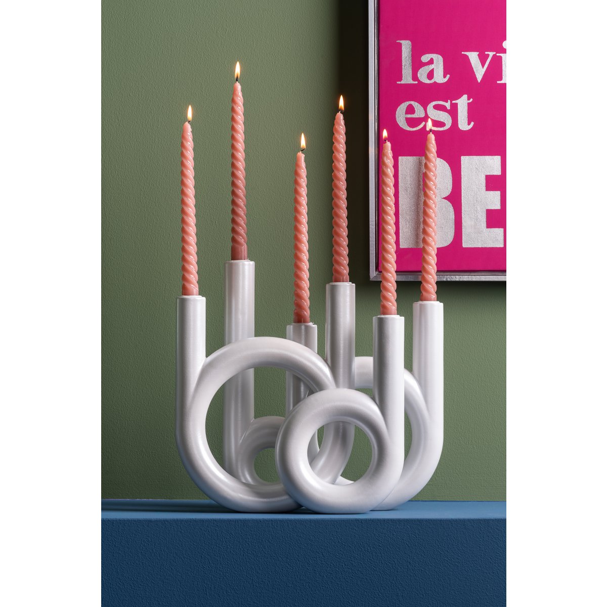 Wil je een gezellige hoek creëren? Zet meerdere kandelaren samen voor een speels effect of gebruik één exemplaar als rustig statement. De witte kleur geeft een frisse uitstraling en reflecteert kaarslicht op een subtiele manier, waardoor de ruimte direct warmer aanvoelt. Gebruik standaard dinerkaarsen of smalle kaarsen die goed in de houders passen.