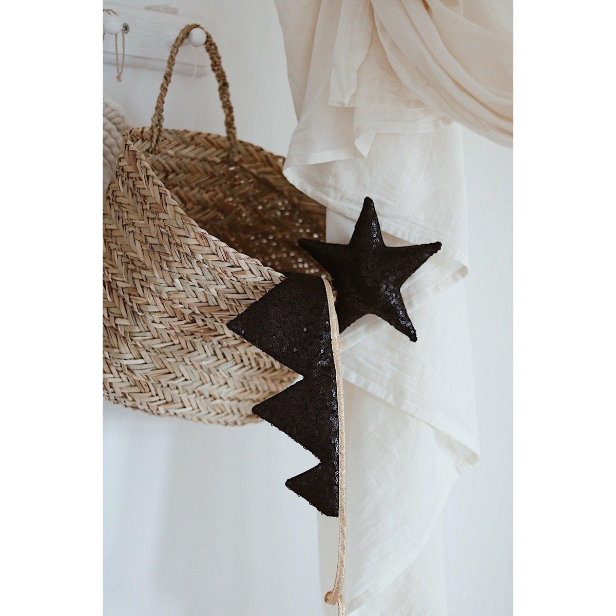 Laat je kleintje zich omtoveren tot koningin, tovenaar of dappere ridder met de "Black pailletten" kroon en toverstaf magische set. Deze set uit de Magic Stories-collectie bevat precies wat nodig is voor eindeloos verkleedplezier: een dubbelzijdige kroon en een glinsterende toverstaf, beide in zwart met pailletten. Perfect voor theaterspel, verjaardagsfeestjes of creatieve fotoshoots — en makkelijk aan te passen dankzij het achteraan bindlint van de kroon.