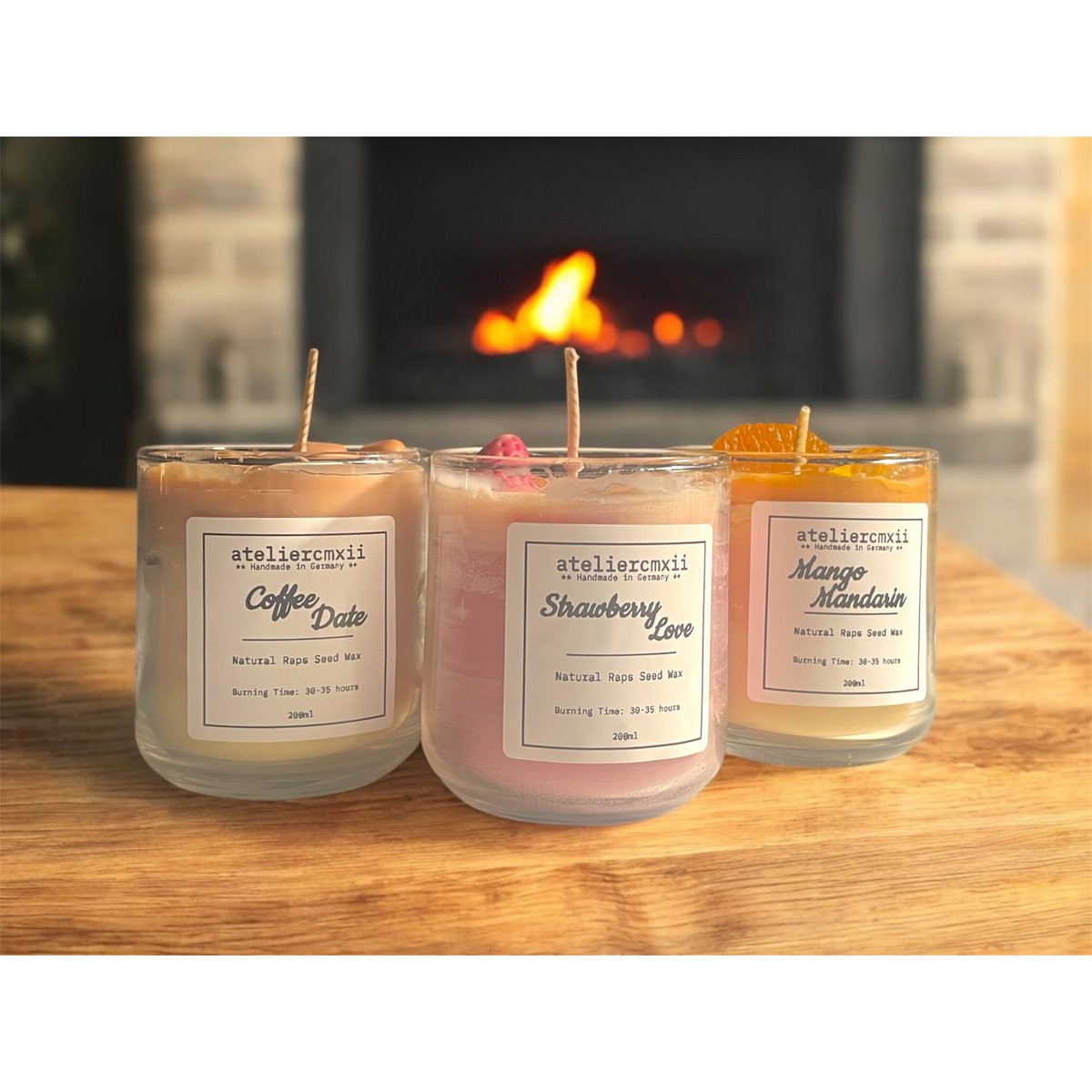 - Materialen: soy wax, koolzaadwas (raps zaadwas), gelwas-oppervlakte