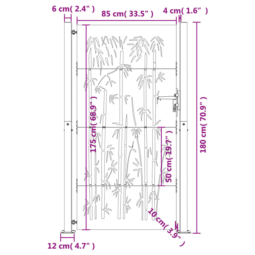 Deze Poort Bamboe-Ontwerp Cortenstaal 105 x 180 cm is de perfecte combinatie van kracht en elegantie, ideaal voor de toegang tot je tuin of terras. Gemaakt van hoogwaardig cortenstaal, ook wel weerbestendig staal genoemd, biedt deze poort niet alleen een unieke uitstraling, maar ook een lange levensduur. Cortenstaal is van nature corrosiewerend en ontwikkelt een roestige beschermlaag wanneer het wordt blootgesteld aan de elementen. Dit betekent dat je je geen zorgen hoeft te maken over schilderen of onderhoudskosten.
