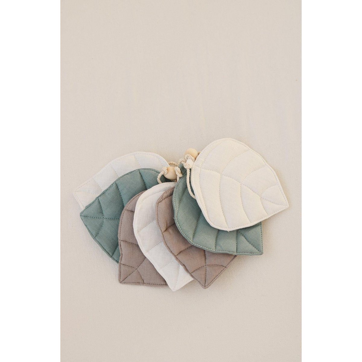 De slinger is zorgvuldig vormgegeven met zeven linnen bladeren in zachte, winterse tinten (3 wit, 2 blauwgroen, 2 grijs). De bladeren hangen aan een katoenen koord dat is versierd met houten kralen — een natuurlijke, warme combinatie die goed past bij houten meubels en neutrale kinderkamerstijlen. Het ontwerp is gemaakt in samenwerking met illustrator Kasia Goraj-Stróżyńska en hoort bij de wintercollectie van Moi Mili, geïnspireerd op sterrenbeelden aan een heldere winterhemel.